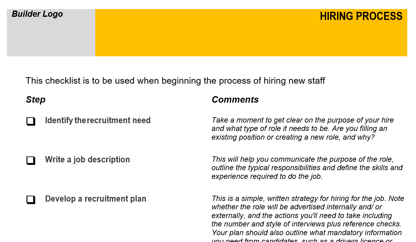 A checklist covering all the important items required during the process of hiring a new employee.