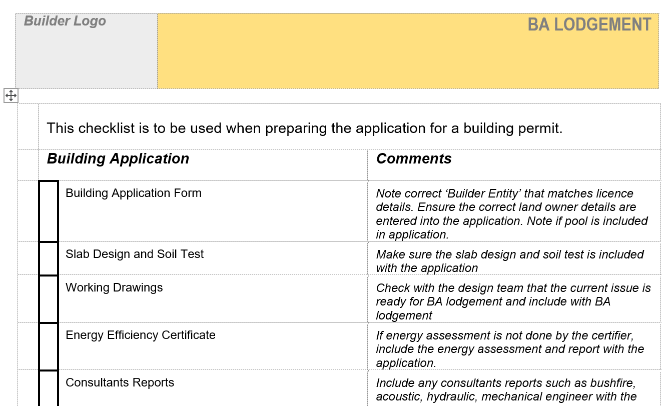 A checklist covering all the important items required to do when lodging an application for building approval.