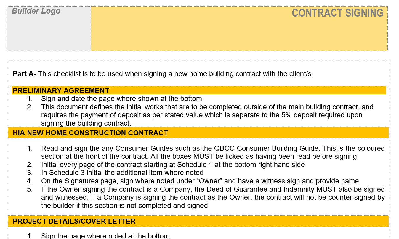 A checklist covering all the important items required when signing a building contract.