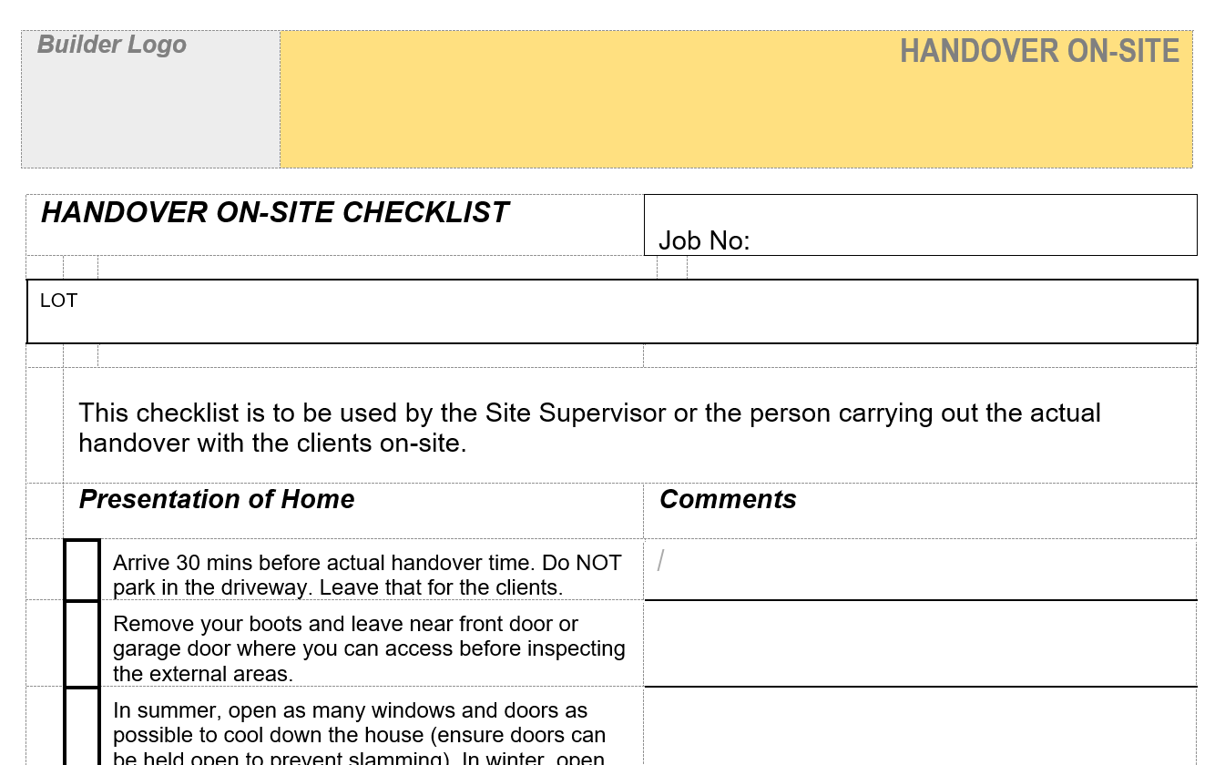 A checklist covering all the important items for site supervisor to go over and cover off with the new owners at a handover on-site.