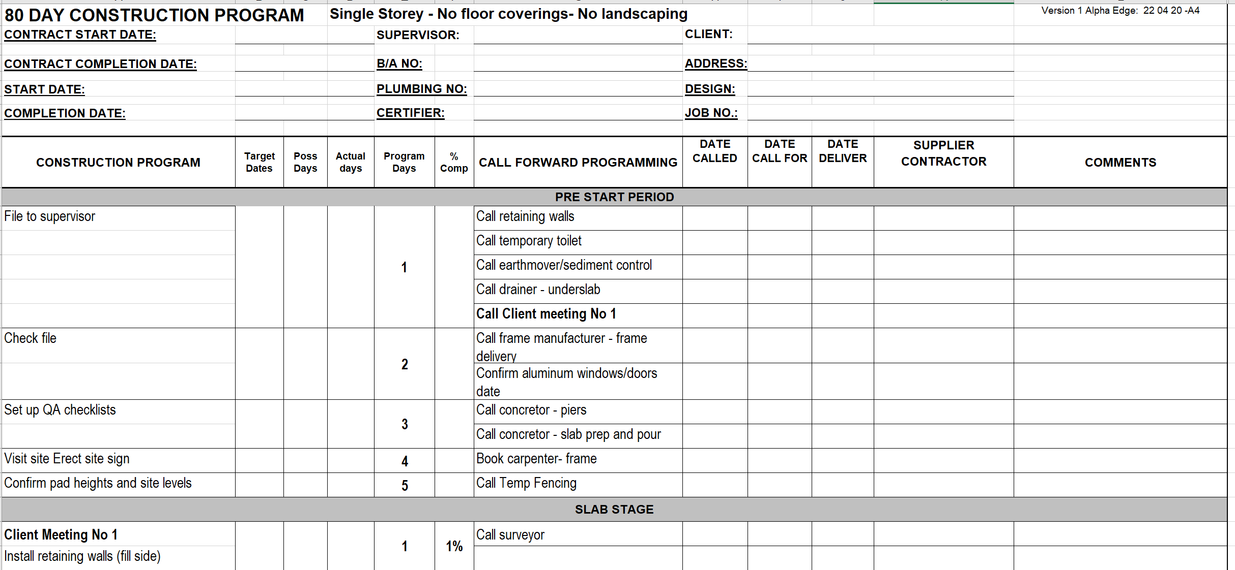 There are instructions for use with each program however, the program combines the Construction Program or the sequencing of the tasks needed to build the home with the 'Call Forward' program. The 'Call Forward' term comes from the 'lead time' or amount of time needed to call up materials and labour ahead of the date required to be on-site.