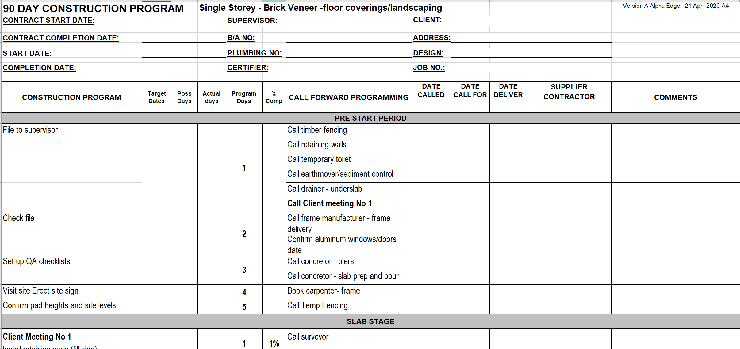 There are instructions for use with each program however, the program combines the Construction Program or the sequencing of the tasks needed to build the home with the 'Call Forward' program. The 'Call Forward' term comes from the 'lead time' or amount of time needed to call up materials and labour ahead of the date required to be on-site.