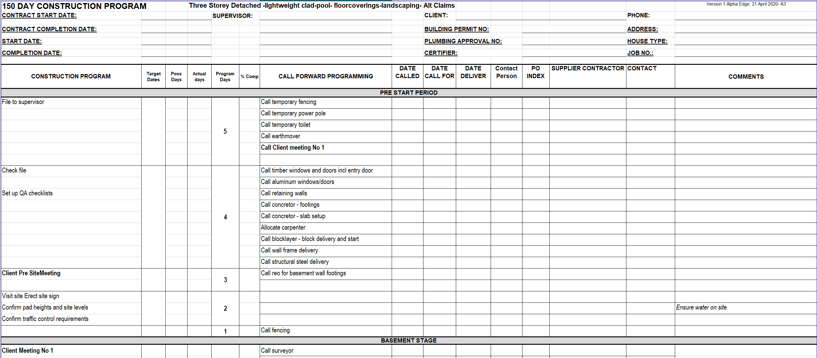 There are instructions for use with each program however, the program combines the Construction Program or the sequencing of the tasks needed to build the home with the 'Call Forward' program. The 'Call Forward' term comes from the 'lead time' or amount of time needed to call up materials and labour ahead of the date required to be on-site.