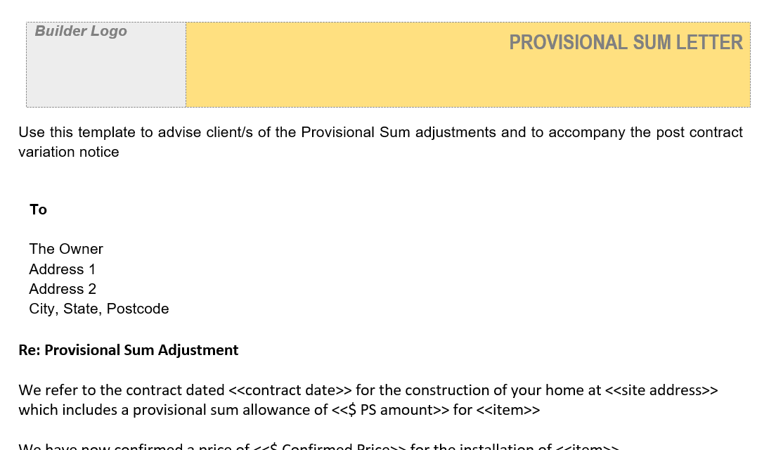 This letter template is used to confirm the Provisional Sums (PS) to a client and can be accompanied by a post contract variation to adjust the contract price.