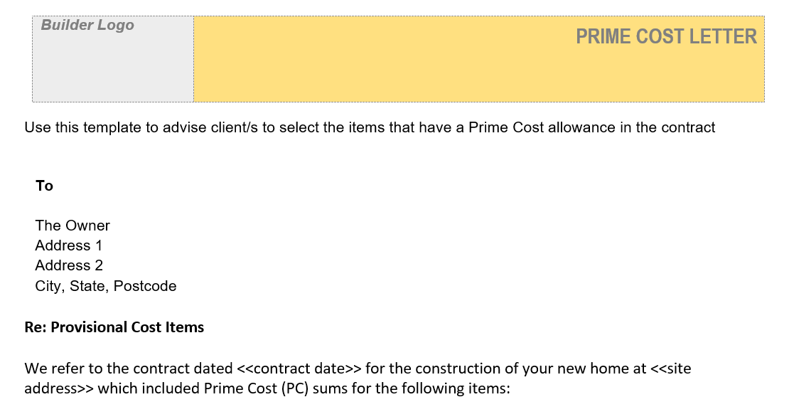 This letter template provides an example of how to request the client/s to select the items that have Prime Cost sums (PC) in the contract.