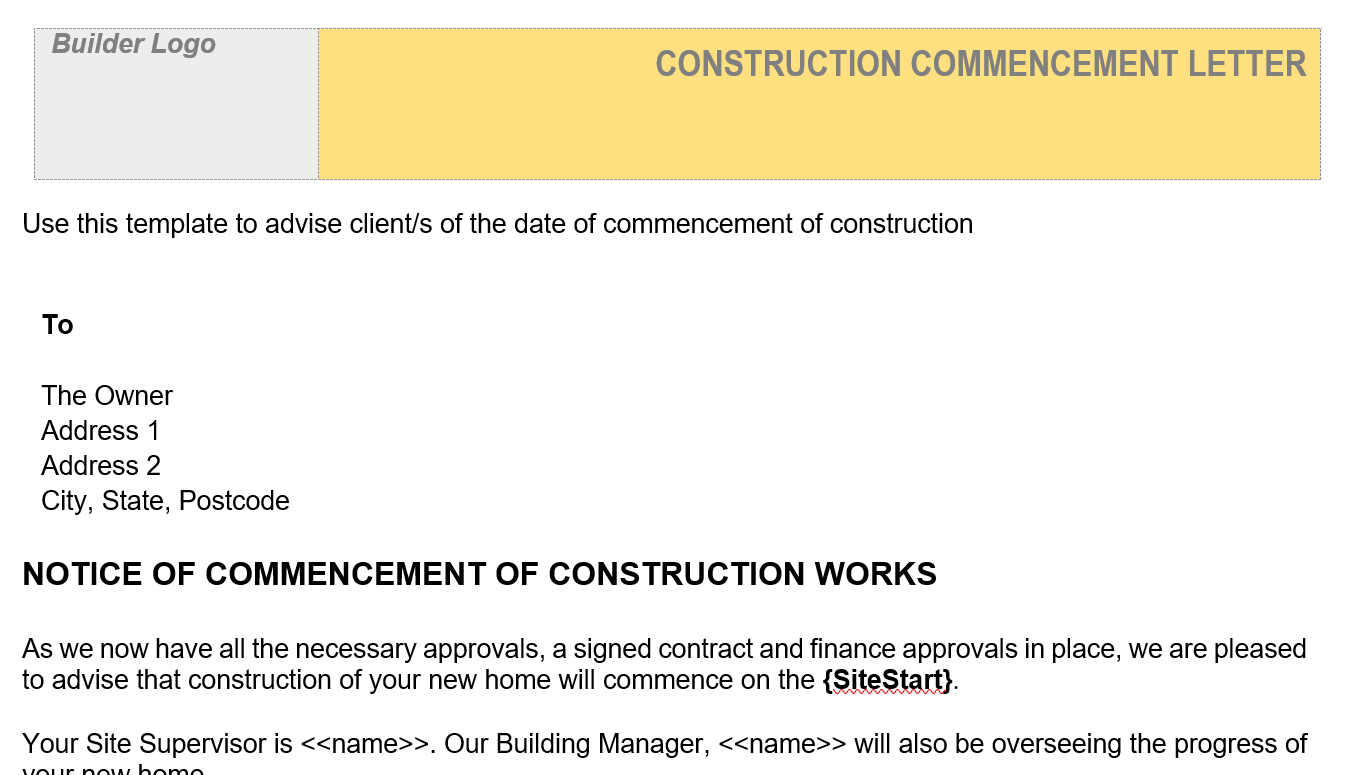 Under most new home building contracts, it is a requirement to notify the client/s of the construction commencement date.