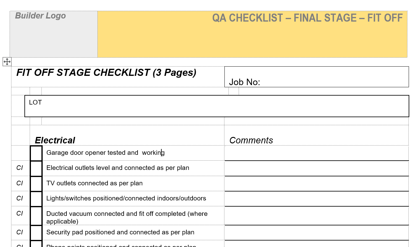Checklists are proven to increase efficiency and productivity in your business. These QA checklists apply to the critical stages of home construction to ensure a quality assurance process is followed during construction. Using these checklists avoids a supervisor forgetting any critical inspection points and also provides the trade contractor with a list of the items and criteria that will be checked. If you use a computer program to undertake site inspections, these QA checklists will be a great benchmark or they can be used to create the critical items in a computer program or cloud based application.