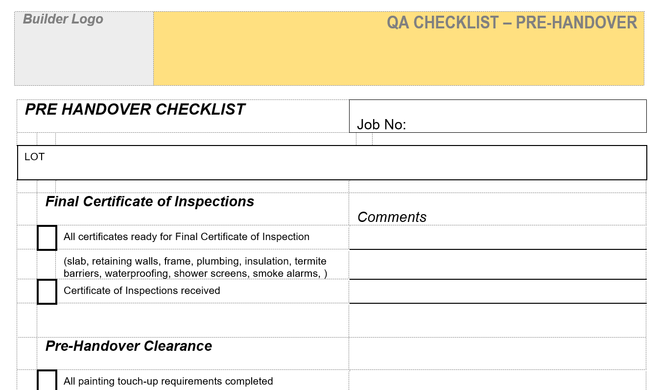 QA checklist to use when checking all items, certificates and house is ready for the handover to the client.