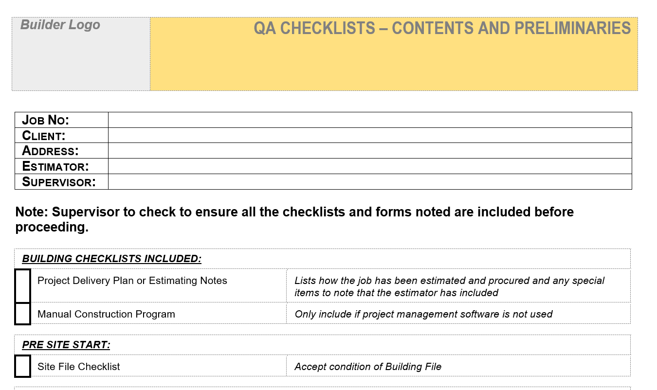 This document sets out the QA checklists available during construction plus an explanation of how to use the checklists and a Site File Checklist to use before construction commences. This forms the preliminary documents to combine with all the required QA checklists.