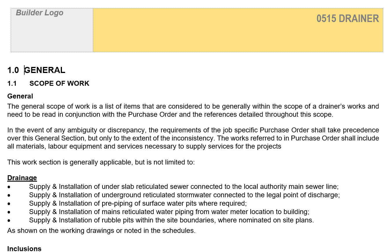 This scope of work document helps you clearly define the extent of work to be carried out by the contractor for that trade or element of the home. It serves as a formal document that describes the work to be done, any excluded work, referenced standards, materials, workmanship and standards of quality to be used that will apply on all building sites and covers items that are not covered by a Standing or Period Agreements and WH&S obligations.