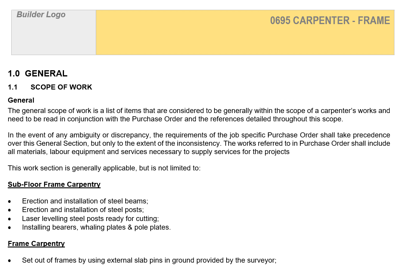 This scope of work document helps you clearly define the extent of work to be carried out by the contractor for that trade or element of the home. It serves as a formal document that describes the work to be done, any excluded work, referenced standards, materials, workmanship and standards of quality to be used that will apply on all building sites and covers items that are not covered by a Standing or Period Agreements and WH&S obligations.