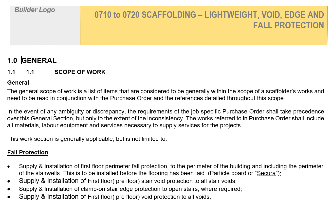 This Scope of Works sets out the extent of work and expectations of the supply and erection of the lightweight scaffold, void protection, edge protection and roof fall protection on projects.
