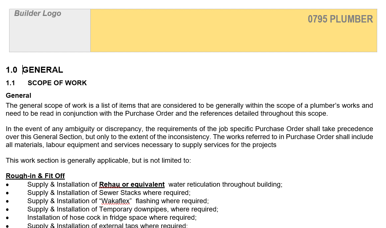 This scope of work document helps you clearly define the extent of work to be carried out by the contractor for that trade or element of the home. It serves as a formal document that describes the work to be done, any excluded work, referenced standards, materials, workmanship and standards of quality to be used that will apply on all building sites and covers items that are not covered by a Standing or Period Agreements and WH&S obligations.