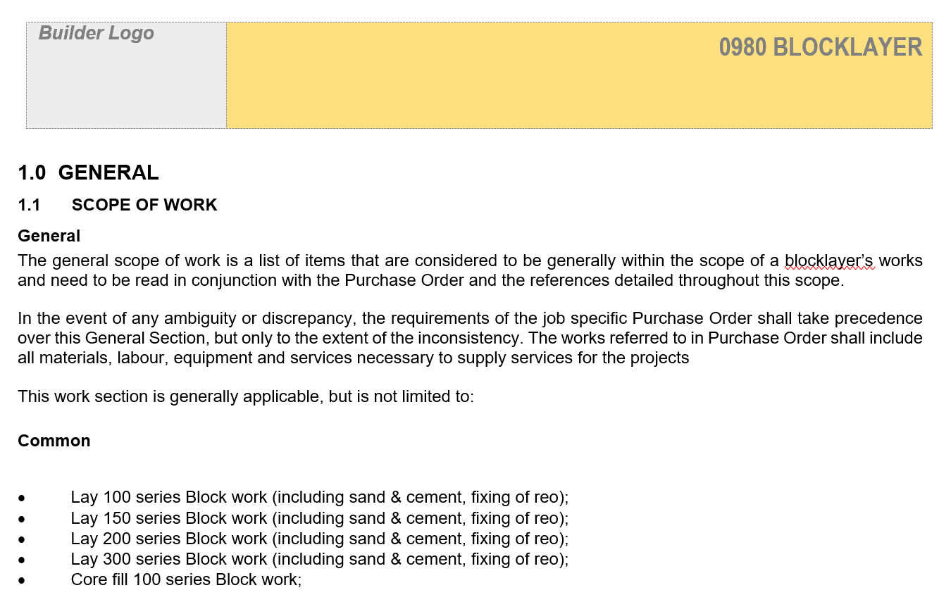 Scope of Works sets out the extent of work and expectations of the workmanship and execution for the blockwork on projects.