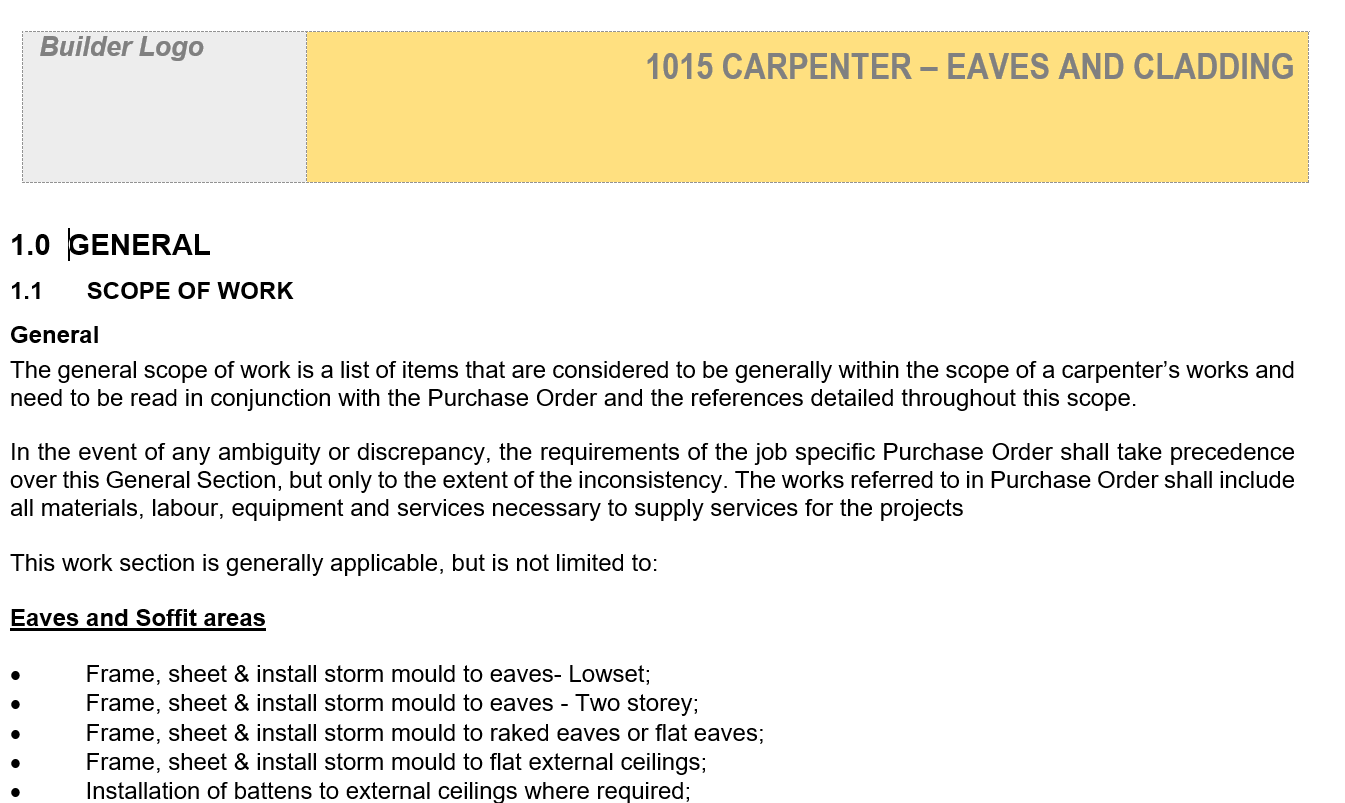 This Scope of Works sets out the extent of work and expectations of the workmanship and execution for the carpenter installing eaves and external cladding works on projects.