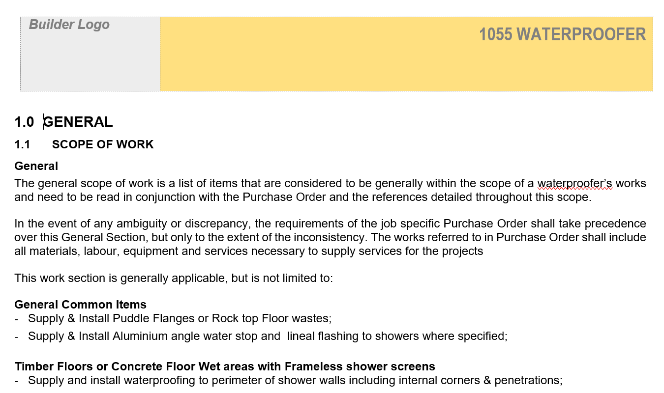 This Scope of Works sets out the extent of work and expectations of the workmanship and execution for the waterproofing works on projects.
