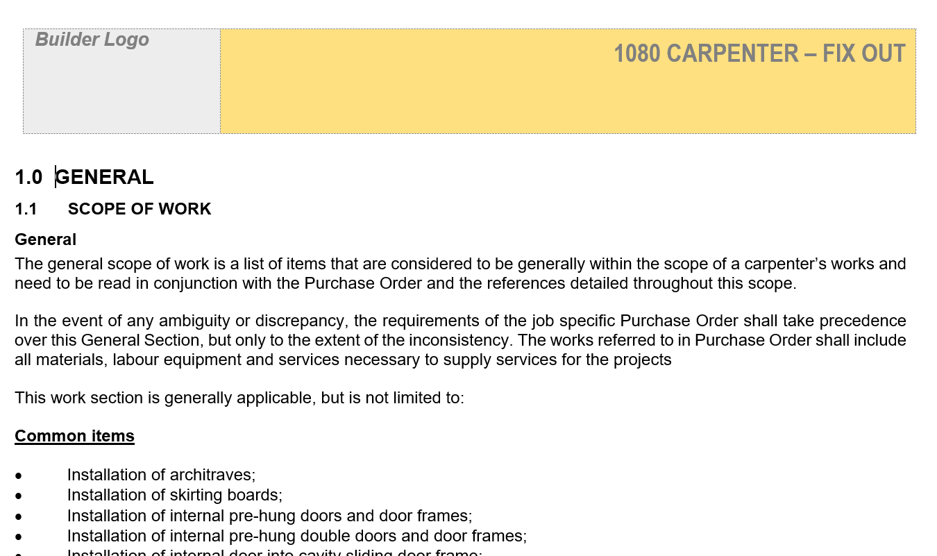 This scope of work document helps you clearly define the extent of work to be carried out by the contractor for that trade or element of the home. It serves as a formal document that describes the work to be done, any excluded work, referenced standards, materials, workmanship and standards of quality to be used that will apply on all building sites and covers items that are not covered by a Standing or Period Agreements and WH&S obligations.
