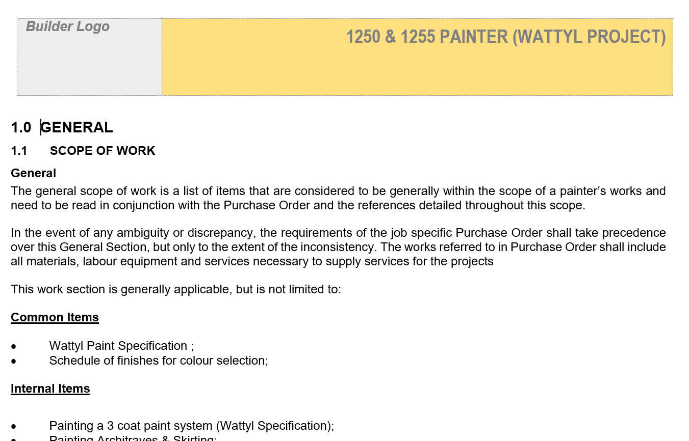 This scope of work document helps you clearly define the extent of work to be carried out by the contractor for that trade or element of the home. It serves as a formal document that describes the work to be done, any excluded work, referenced standards, materials, workmanship and standards of quality to be used that will apply on all building sites and covers items that are not covered by a Standing or Period Agreements and WH&S obligations.