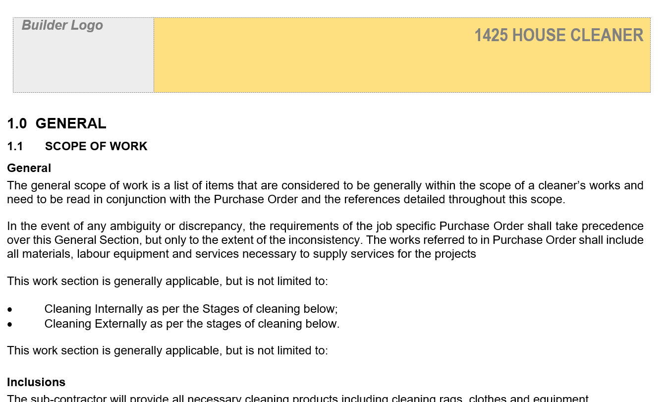 This scope of work document helps you clearly define the extent of work to be carried out by the contractor for that trade or element of the home. It serves as a formal document that describes the work to be done, any excluded work, referenced standards, materials, workmanship and standards of quality to be used that will apply on all building sites and covers items that are not covered by a Standing or Period Agreements and WH&S obligations.