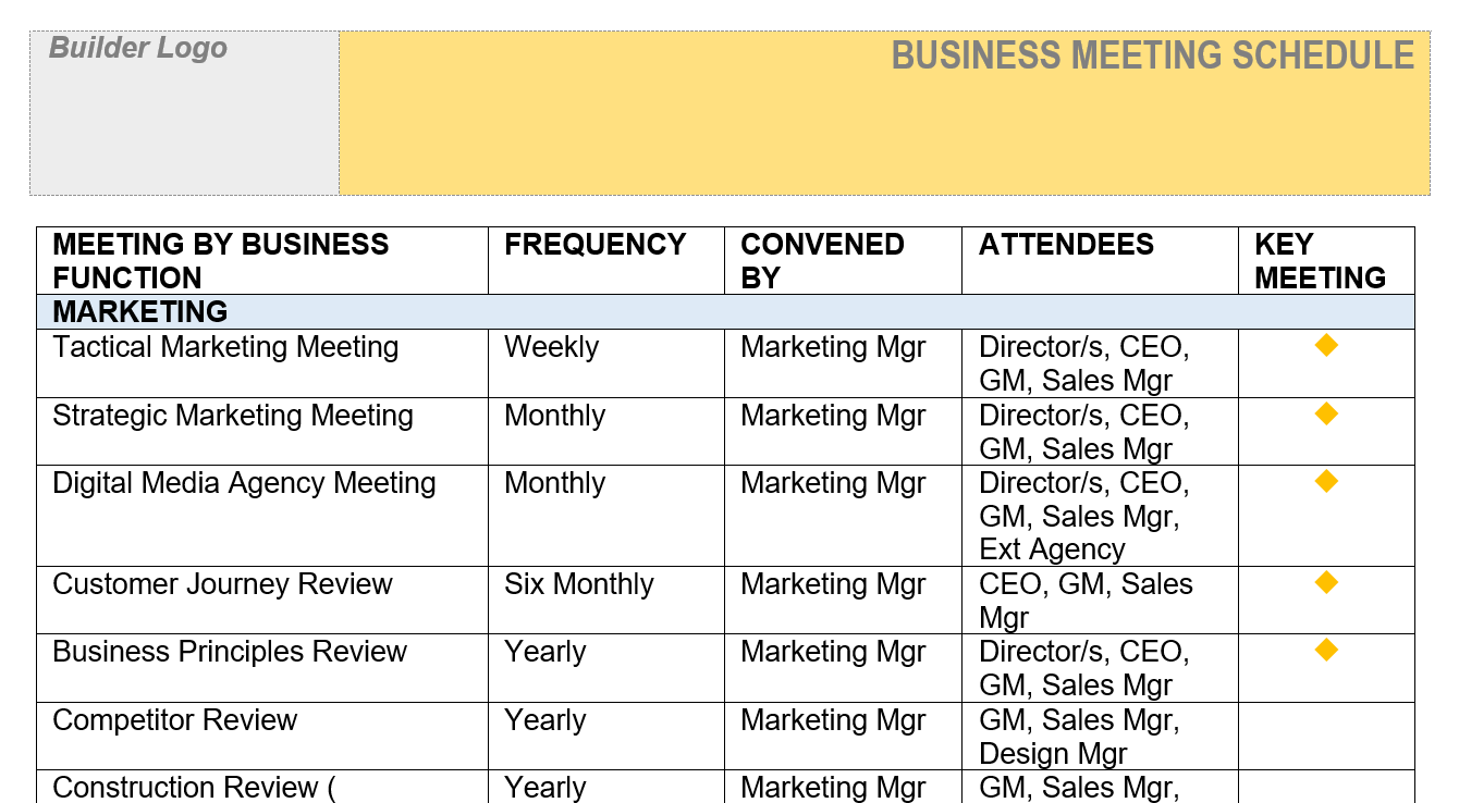 This template has been developed over many years of experience in multi national and boutique businesses so it provides a degree of structure to meetings and can serve as a type of reminder to include specific agenda items for the business.
