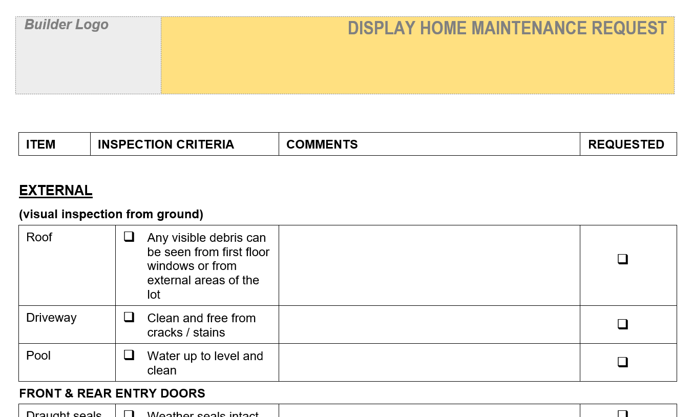 This template provides a guide to create a process for requesting maintenance around a display home or sales office. The pre-formatted layout takes the guesswork out of the inspection process by sales staff.