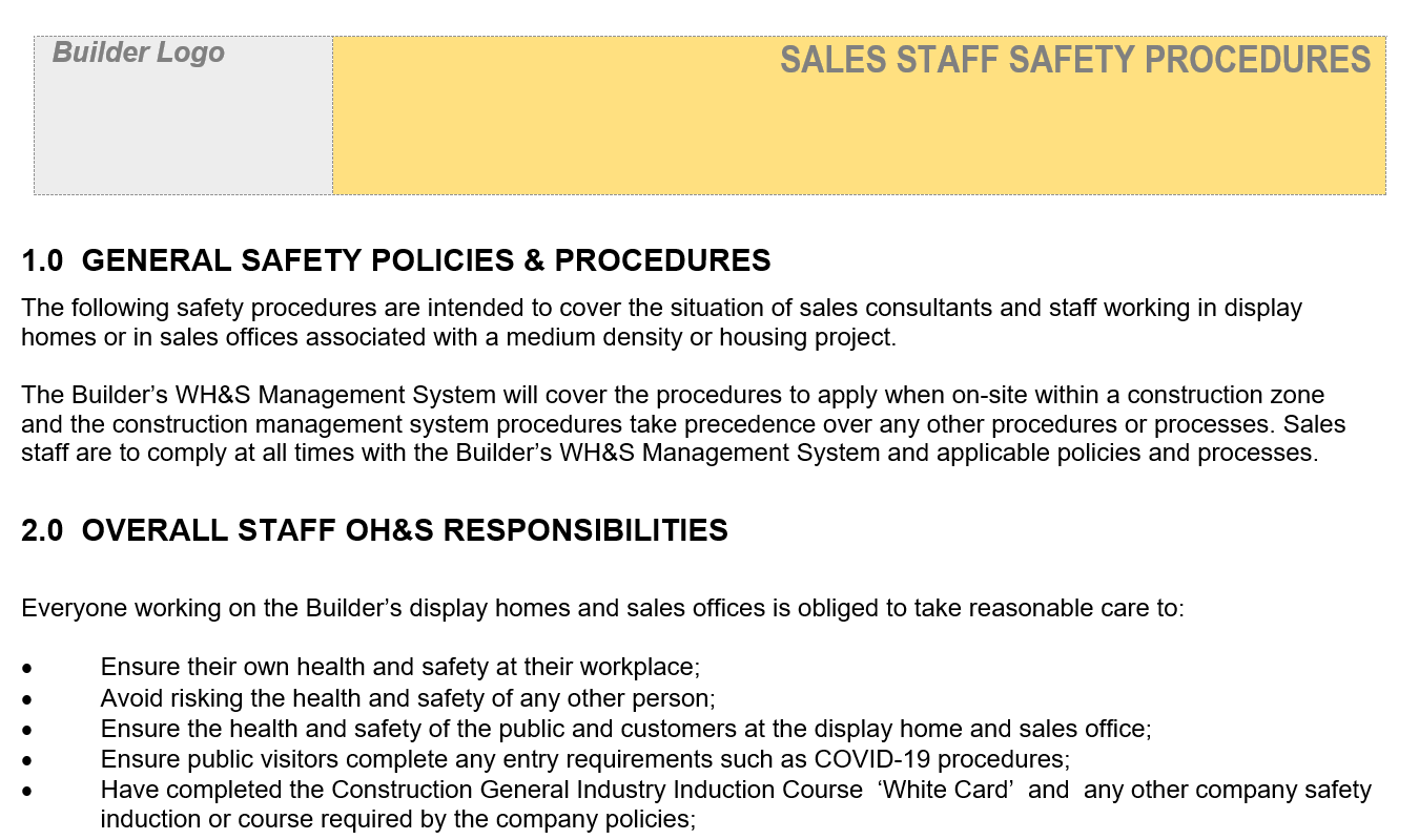 This template is for the safety procedures for sales  staff in display homes or in sales offices associated with a medium density project or housing development.
