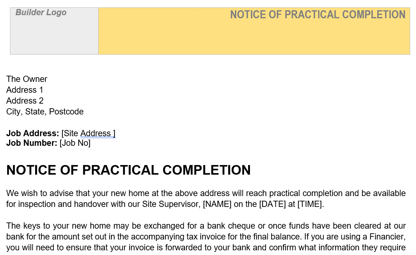 This template is for the formal Notice of Practical Completion advising when the new home is ready to be handed over.