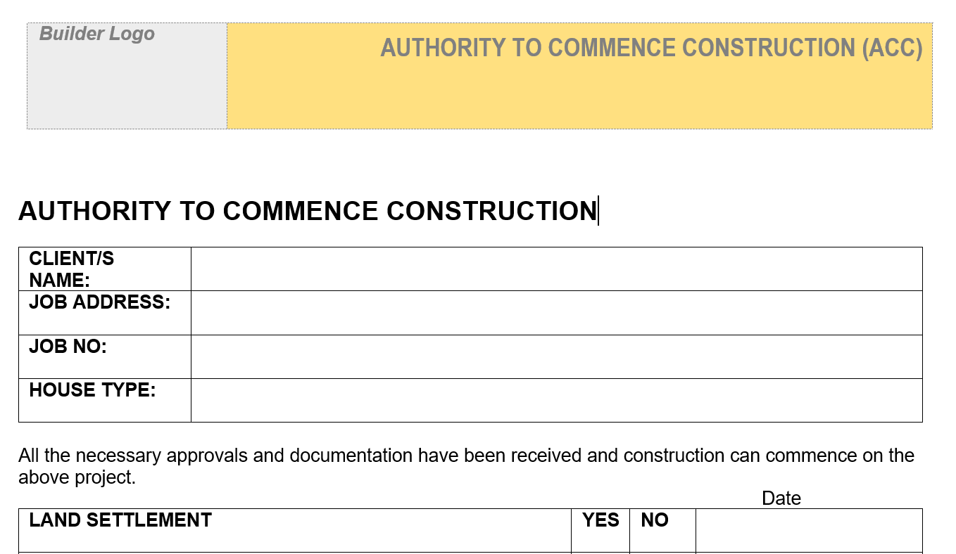 Because there are numerous approvals and documents required to be signed off prior to commencing construction, an ACC is a good process to put in place as good governance in a building business and for risk management. It ensures that those responsible for giving the 'green light' to start construction are sure all the approvals and required signatures are in place.