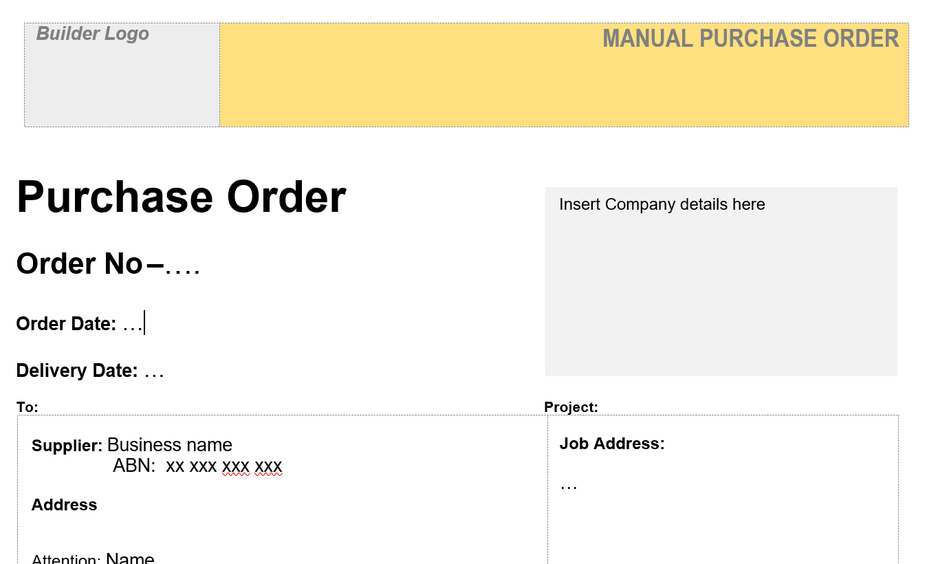This template for a manual order form is useful when needing to provide a purchase order for goods and materials outside of the estimating system. It can also be used a s a template for creating a manual order book for site supervisors out in the field.