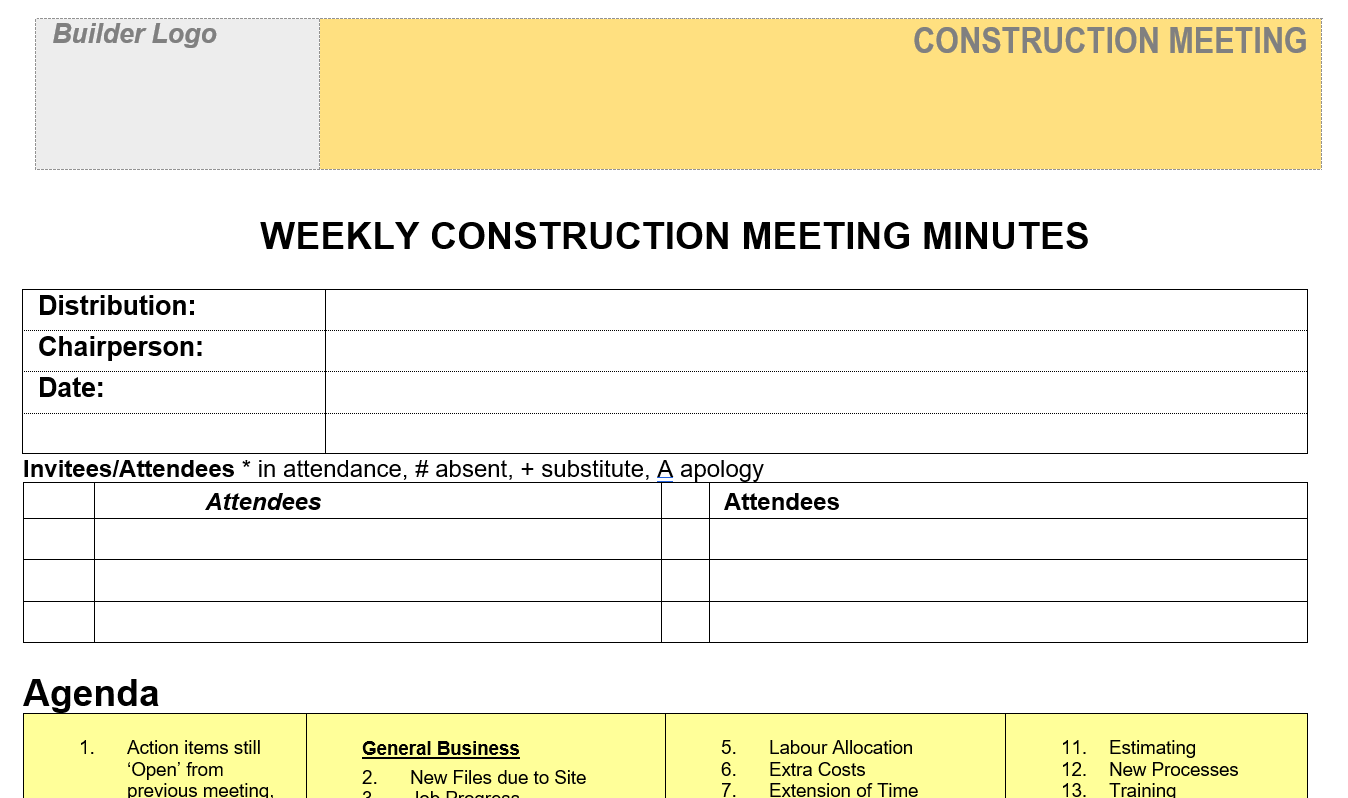 The template helps you to get the Construction Meeting happening quickly. Most times you want to start a meeting but you have no document for the agenda or minutes. This template gets you up and running quickly and allows to you adapt it to your business. It is also useful to make sure you have covered off on everything you should discuss in a Construction Meeting.